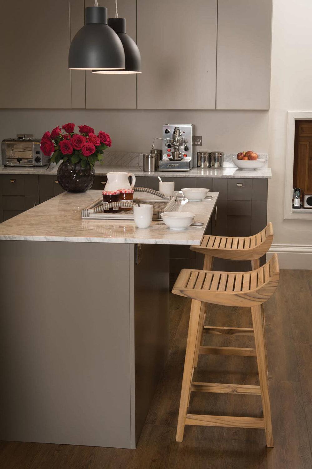 The Menton Kitchen Stool features a stylish mid-century wooden design with a distinctive bullhorn-shaped seat. Its 66cm seat height makes it ideal for kitchen counters.