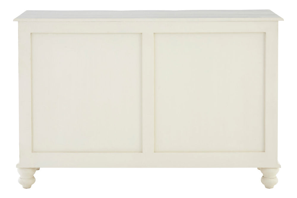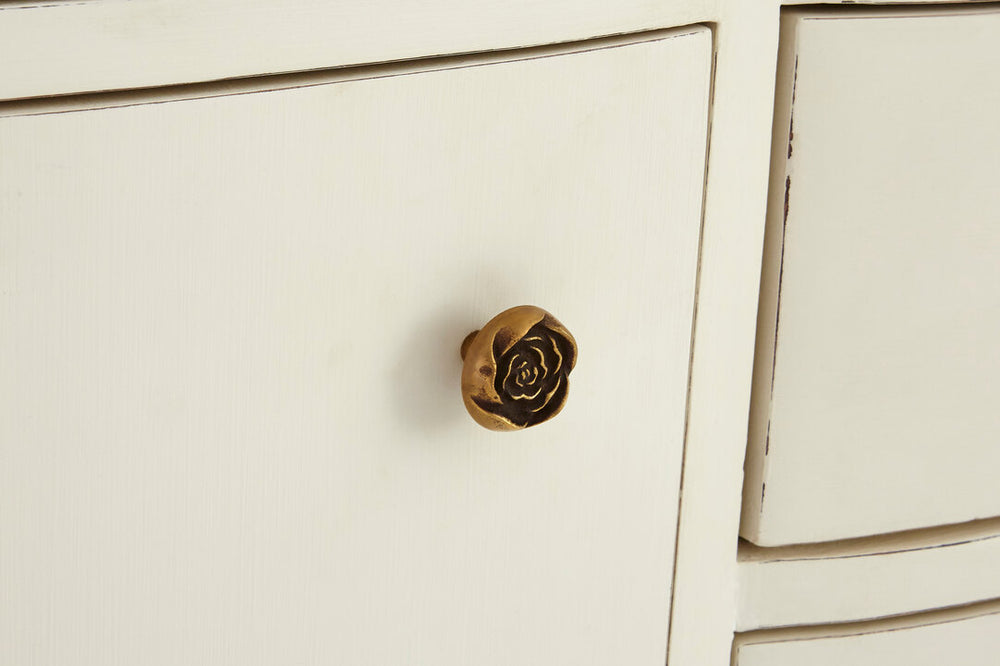 An aesthetically functional addition for a variety of abodes, the Vienne 6 drawer sideboard is crafted from sustainable wood with metallic handles. It boasts six drawers, each with a brass finished baroque-style pull handle. The two cupboards at either side feature elegant rose shaped handles in matching brass colour. Subtle distressing to the paintwork adds a rustic appeal and lends this sideboard well to boho inspired interiors. Knopped feet raise this stylish accent piece from the floor.