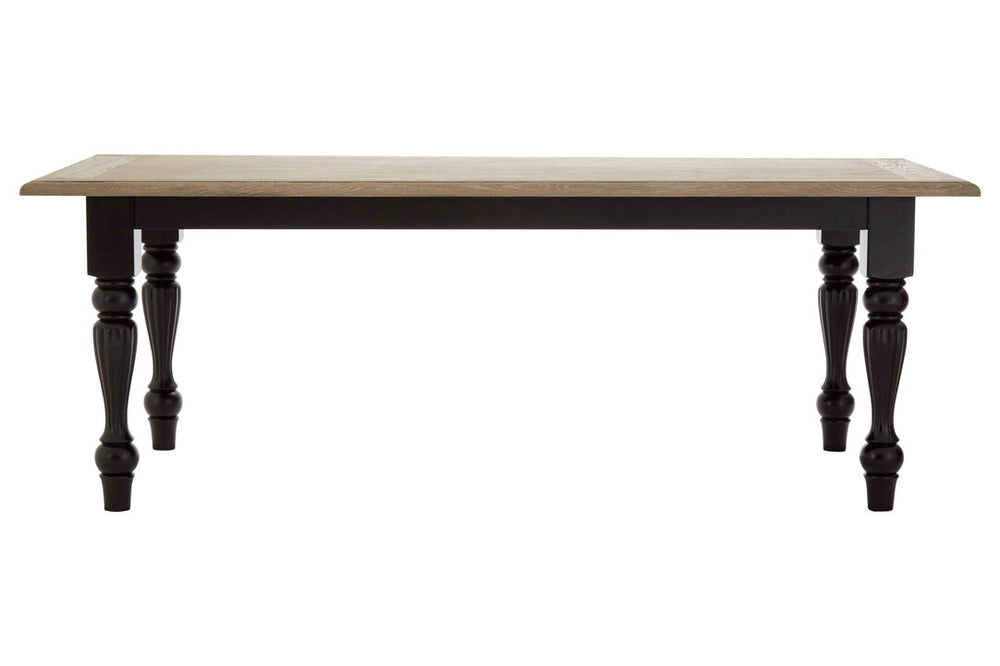 The Westbury House dining table has an oak wood top covered with a thin layer of oak veneer that gives durability to it. It has turned legs made from strong birchwood, with an antique black finish that accentuates their knopped and pillared design.