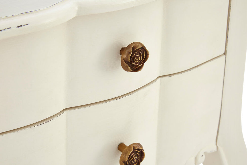 Crafted from bayur wood, the Vienne bedside has a smooth white painted finish. Carved detailing is accentuated by subtle distressing to the paintwork. Modest rose shaped knobs are situated in the middle of each drawer and feature a warm brass finish. Curved legs add to the table's elegant appeal.