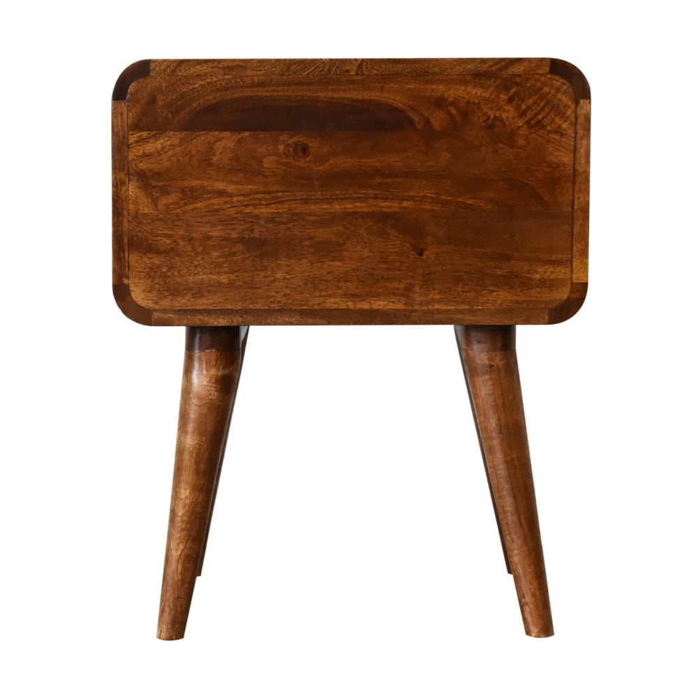 Endlessly versatile, the Curved Chestnut Bedside Table makes a perfect stand for nibbles, drinks, or a lamp. It will prove handy all over your home and is made from 100% solid mango wood and has a fine chestnut finish. It has curved edges which will fit into any home/living space. It also comes with 2 drawers that come with shiny knobs and 4 Nordic style legs.