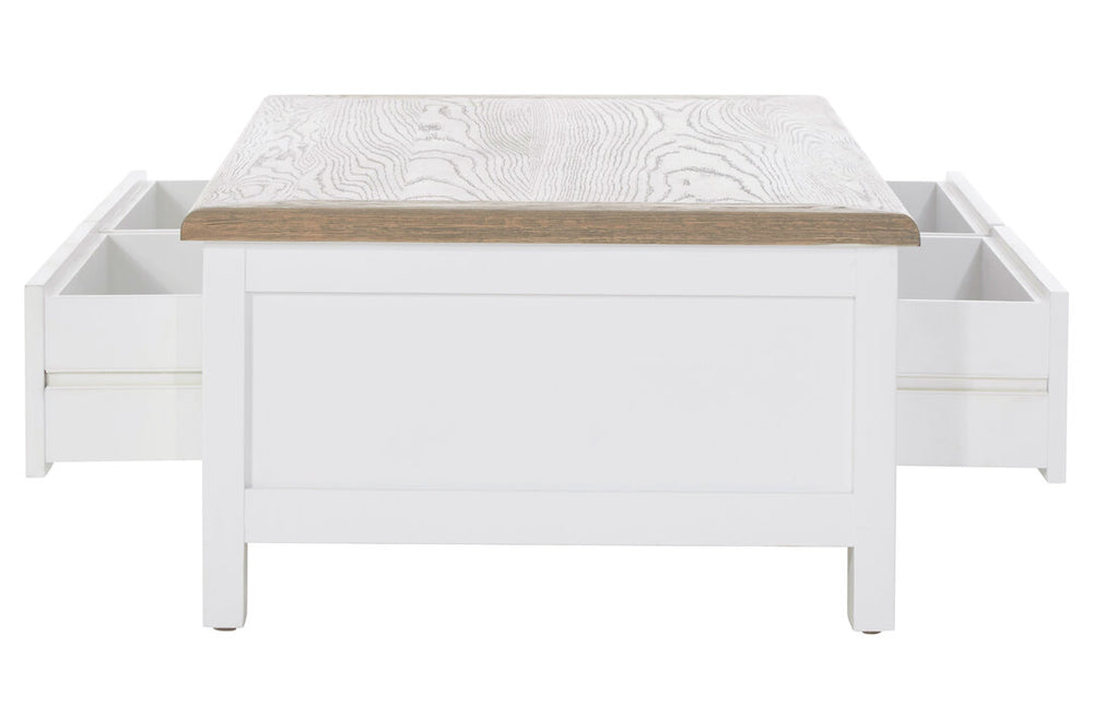The Bourton 2 Drawer Coffee Table utilises natural beech wood to create its low profile cabinet. Its clean white finish complements the rectangular tabletop's rich oak tones. Each leg features a small disc at the foot, designed to protect flooring from scratches. Both drawers are adorned with carved metal handles, providing space to stow reading materials and remote controls.