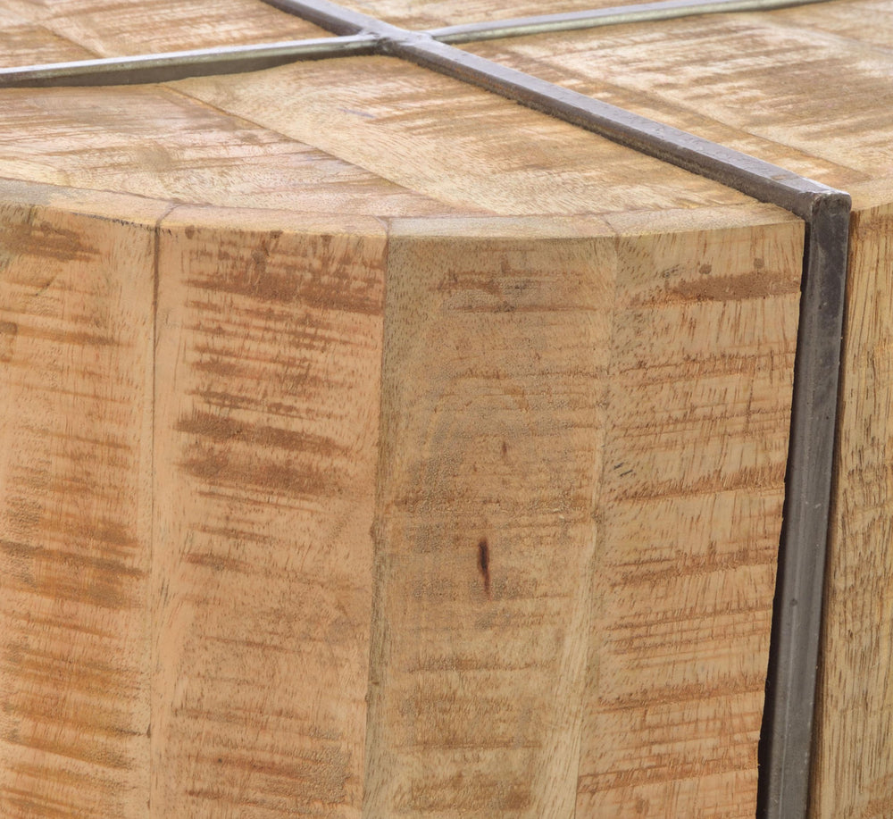Old Empire Round Lamp Table with Metal Detail combines superior quality mango wood with super strong iron in a raw, rustic industrial style. The iron base frame is extended through the whole of the deep top to create a distinct modern look. The legs are very simple straight cut steel welded into a cross shape to support a handy undershelf.