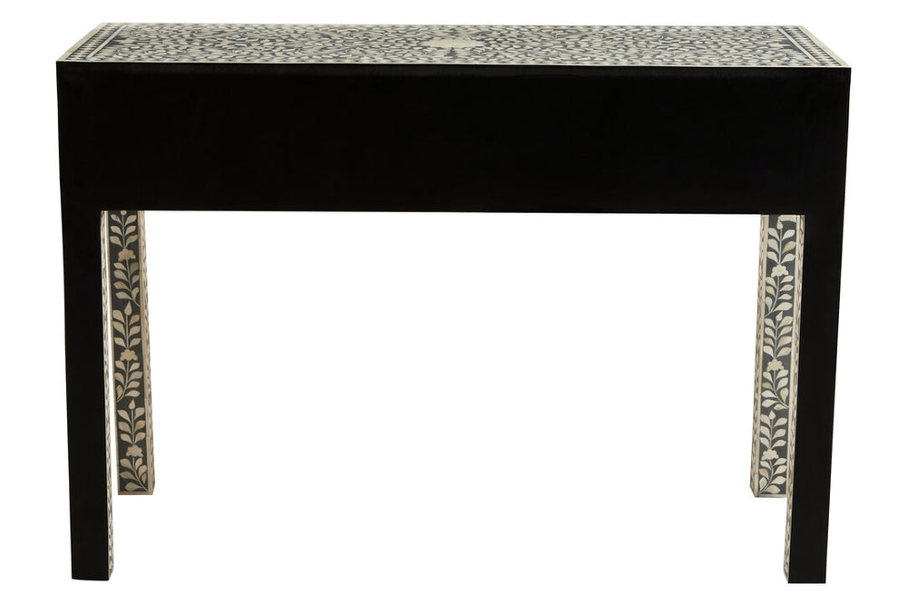 Handcrafted by skilled artisans, this desk features hand laid white buffalo bone detail. Three drawers offer ample storage, each supported with a decorative carved floral drawer knob. The natural bone inlay form an elaborate floral pattern that lends a timeless aesthetic to the design.