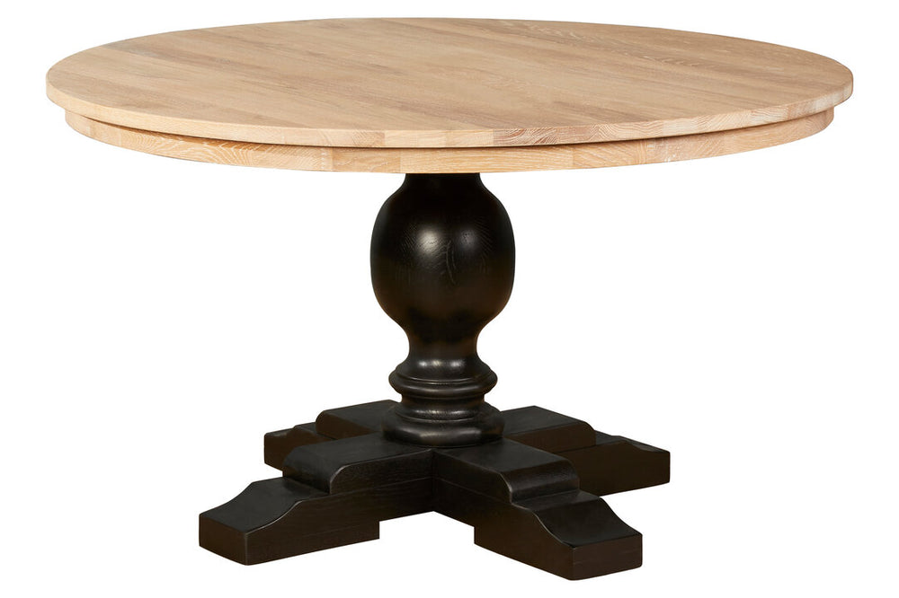 The Arden dining table is made from solid American oak and has a round top which is lightly coloured and features a prominent grain that creates a textured finish. The pedestal base is coloured black to contrast with the top, and boasts four chunky feet and a bulbous central section.