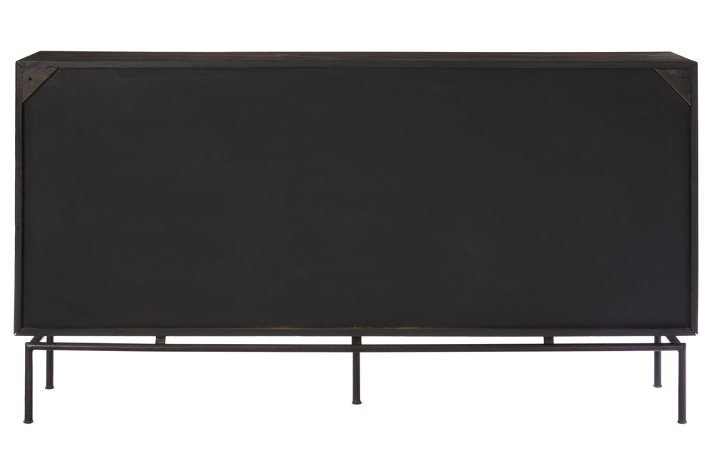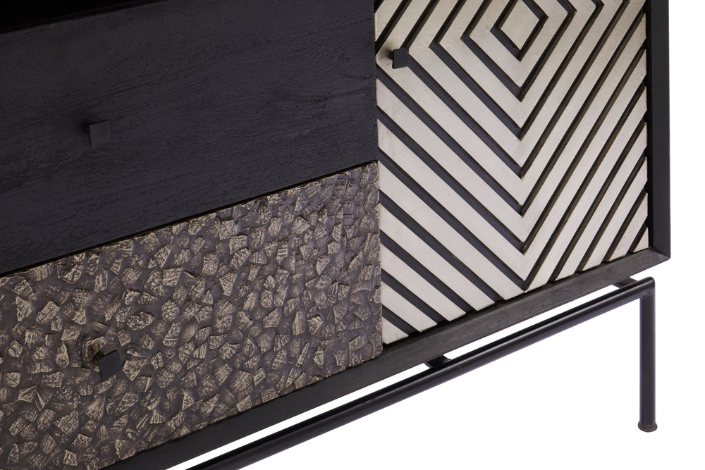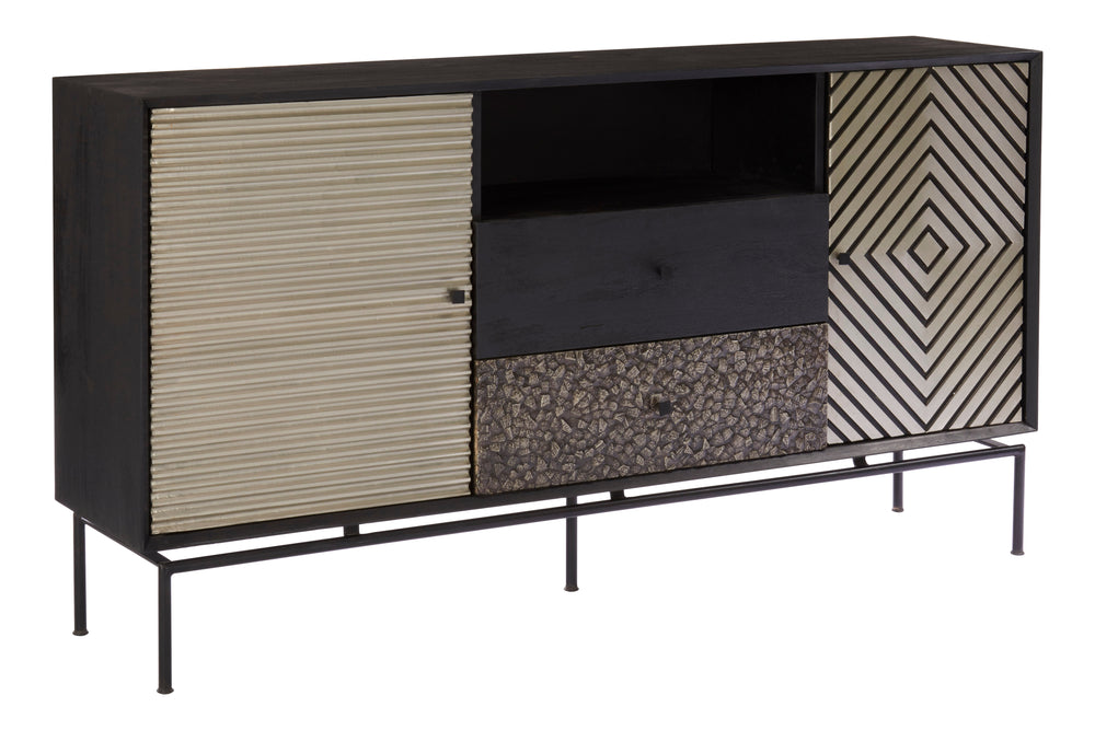 Made from renewable mango wood, the Monot Sideboard is packed with design and functionality. Supported by a simple metal structure the design of each door or drawer gives off a vibe of travel and eclectic design. The middle section has two drawers and an open compartment for showing off travel-led items from across the world. The doors have a trend-led geometric design to finish off the look and make this a statement piece.
