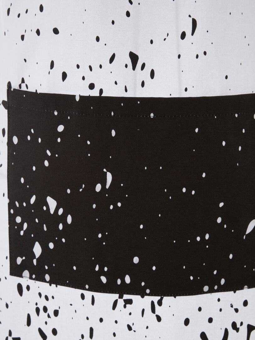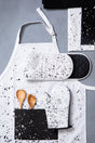 The apron features a white neckstrap that has an adjustable buckle for a customised fit. A contrasting black front pocket with white splater effect enhances the monochromatic aesthetic. Made of pure cotton. It's durable, machine washable and coordinates with our matching Vara range.