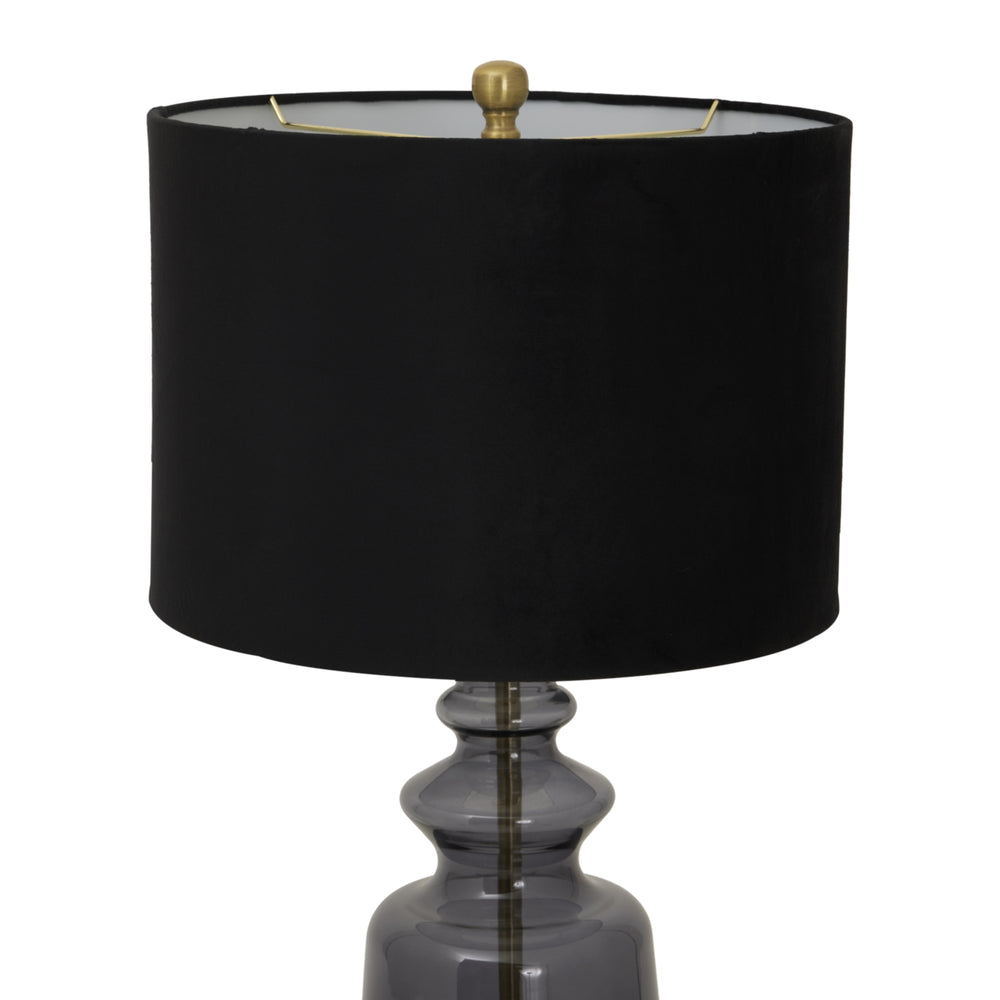The Luxton Glass Urn Lamp features a clear glass base with elegant craftsmanship, paired with a sleek black velvet shade. Its design balances light and shadow, adding refined depth and style to any room.