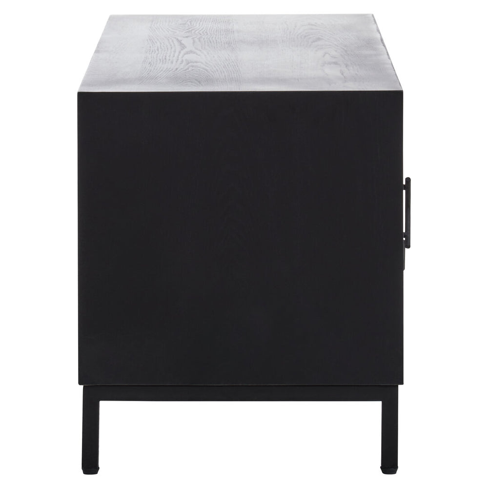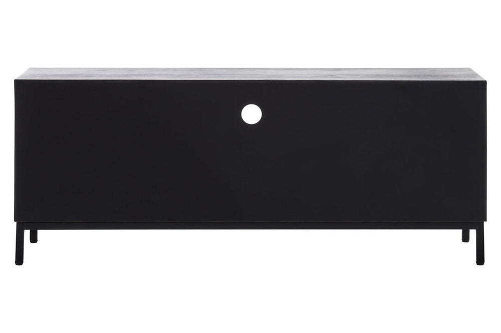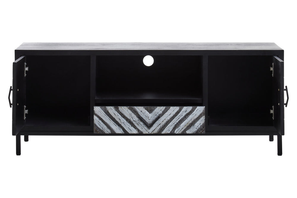 The Nusa black media unit showcases a chevron-patterned front, while the sleek metal frame adds a contemporary edge. Designed for ample storage, this media unit keeps essentials neatly organised while enhancing the look of any living area with its refined, geometric appeal.