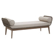 The Kora lounge bench combines contemporary design with laid-back elegance. Featuring a woven frame, upholstered seat, and cylindrical bolster cushions to offer both comfort and sophistication. The slender, tapered wooden legs enhance its refined silhouette, while the neutral tones make it versatile for any interior.