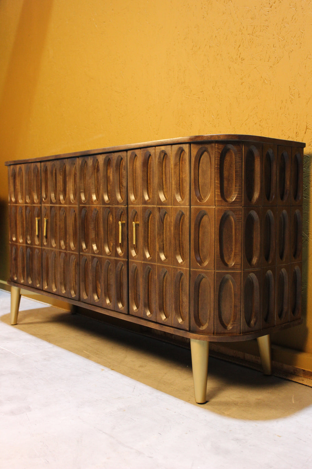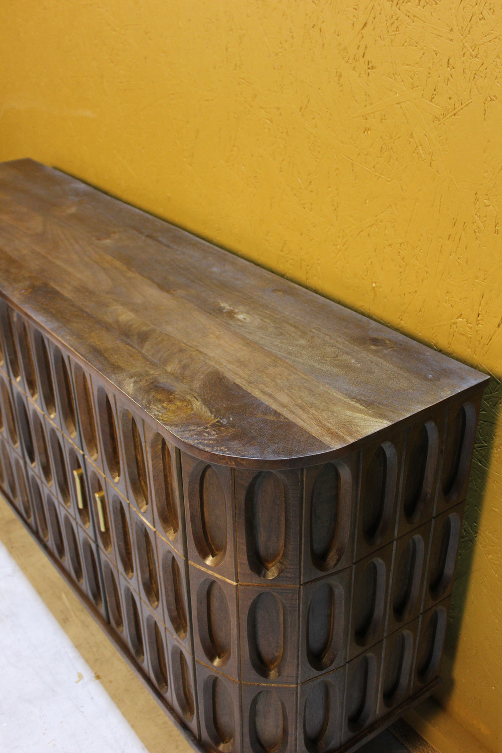 Made from sustainable mango wood, the Jana Sideboard features detailed oval tile carvings across four doors, softened by gently rounded edges. With its blend of craftsmanship and natural materials, it offers spacious, stylish storage—ideal for eco-conscious interiors with an artisanal touch.