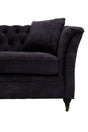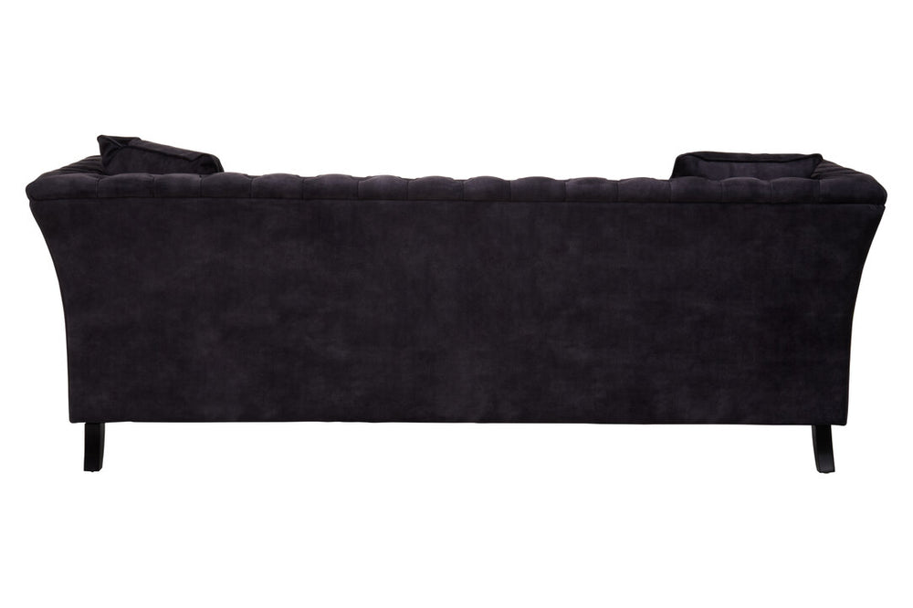 The Lucinda three seater dark grey velvet sofa features a classic chesterfield design with a modern flair. Covered in dark grey velvet, this sofa has button tufting that lends it a decorative texture. Elegant curves of the back and armrests elevate elegance. Supported by castors, the sofa has matching cushions that enhance style and comfort.