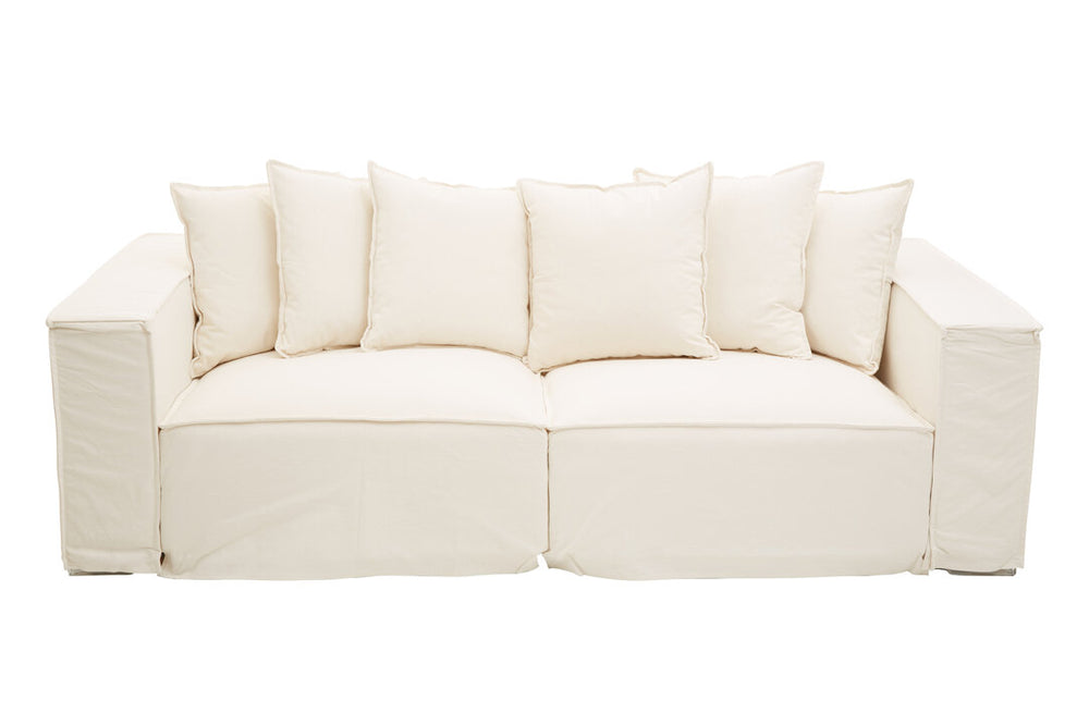 The Versailles sofa features three spacious seats and a low back aligned perfectly with its armrests. Upholstered in linen fabric, the sofa's cream colour coordinates with the matching cushions. With its linear detailing and minimal design, it adds a cool accent to minimalistic decor.