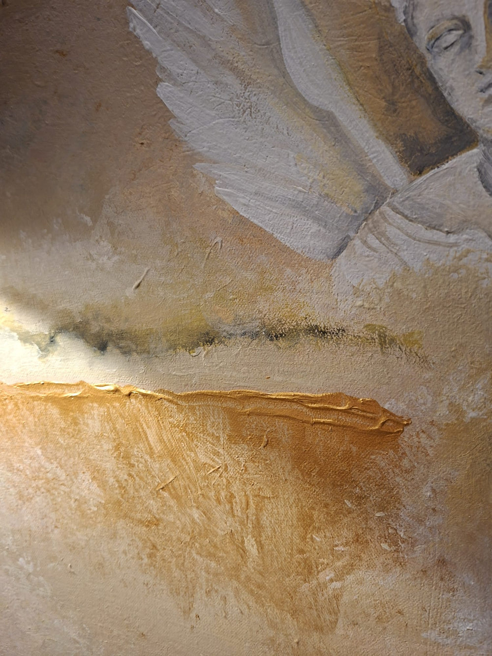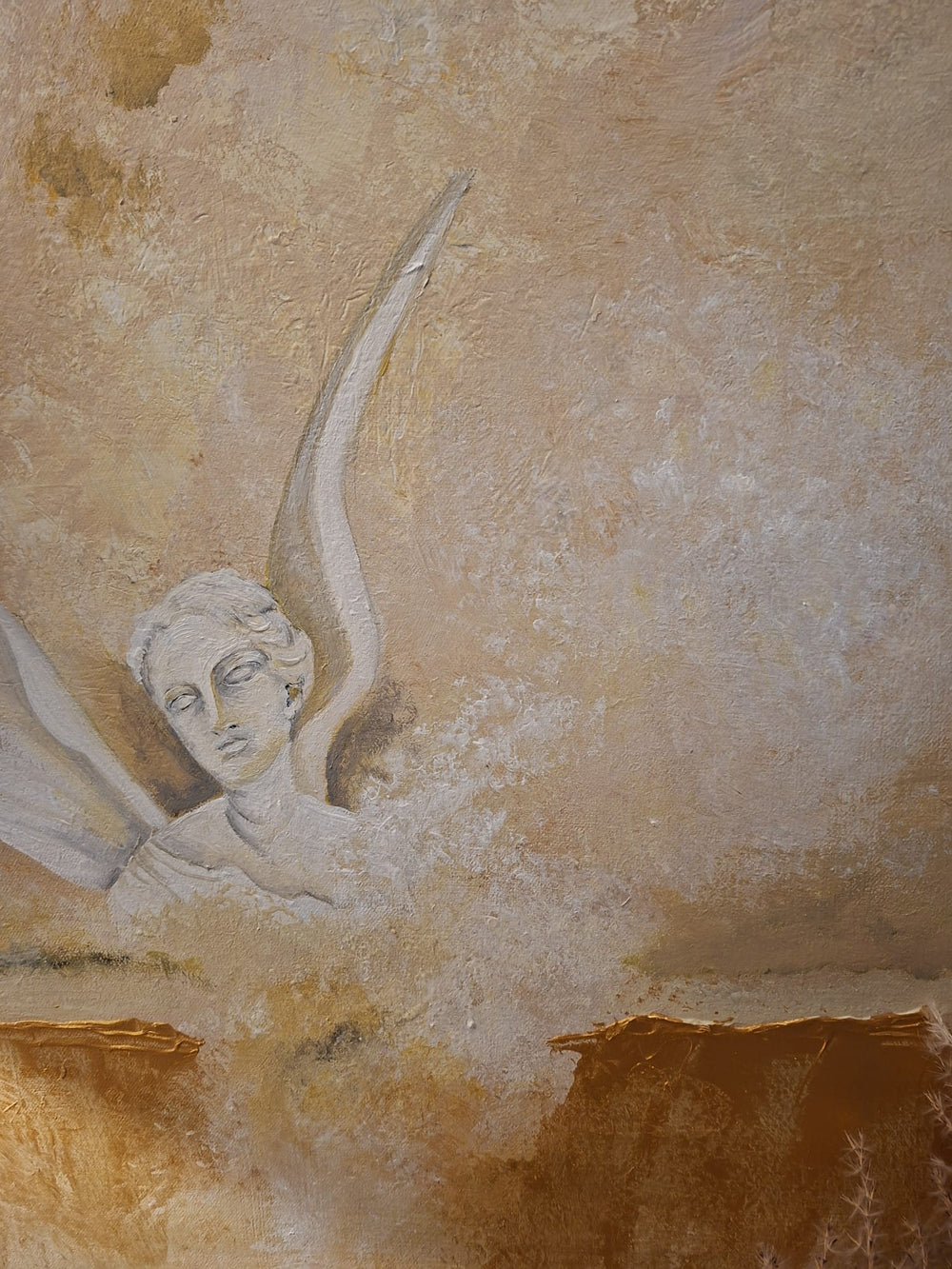 'Ascend' is a striking acrylic composition featuring an ivory sculptural form set against a subtly mottled, earthy backdrop enhanced by atmospheric cloud-like effects. Lustrous gold detailing provides luminous contrast and visual dimension throughout the piece. Each work is meticulously hand-painted on premium stretched canvas, showcasing the artist's dedication to quality craftsmanship. Presented unframed to suit your display preferences.