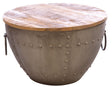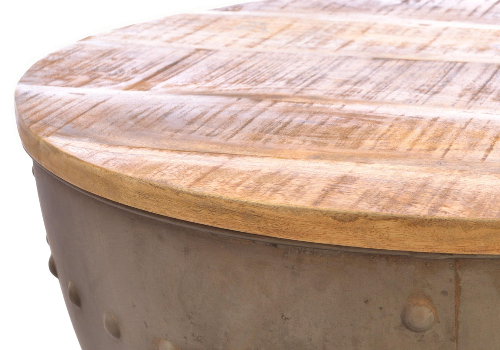 Our Old Empire Round Storage Coffee Table is practical and beautiful. Designed like an old kettle drum, it has a thick solid mango wood round polished top. Underneath it has a gently tapered steel drum with rivets and metal ring handles, so it’s easy to carry from room to room.